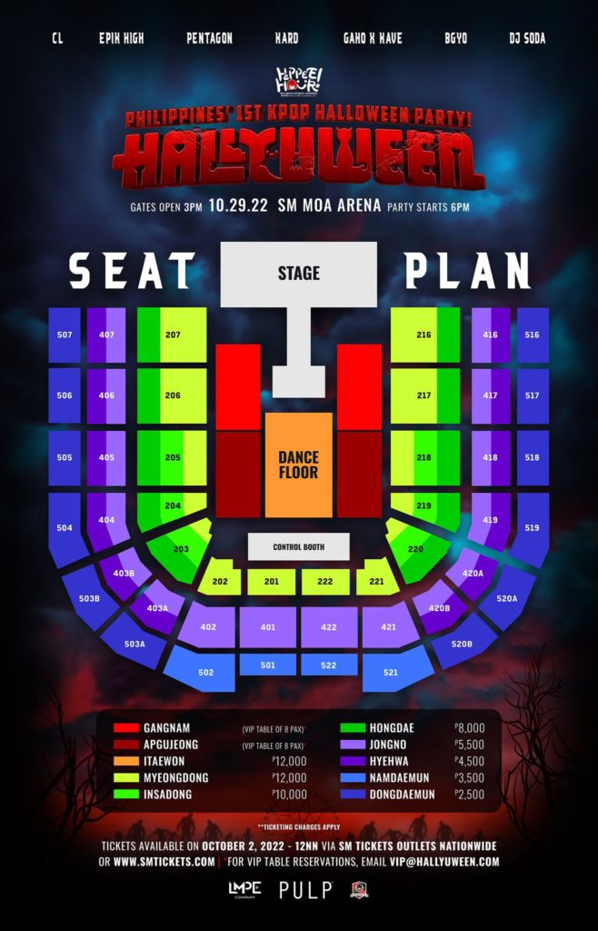 Hallyuween 2022 will take place on October 29th, 2022 at the SM Mall of Asia Arena. The gates open at 3 p.m., and the party begins at 6 p.m.