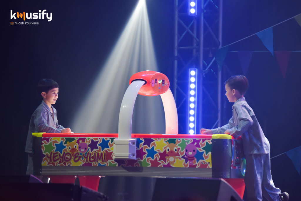 The two kids’ focus was solely on the “air hockey table” when they first entered the stage. After only a brief chat with the host, they hurriedly walked over to the gaming table to play. What are kids here for, right?
