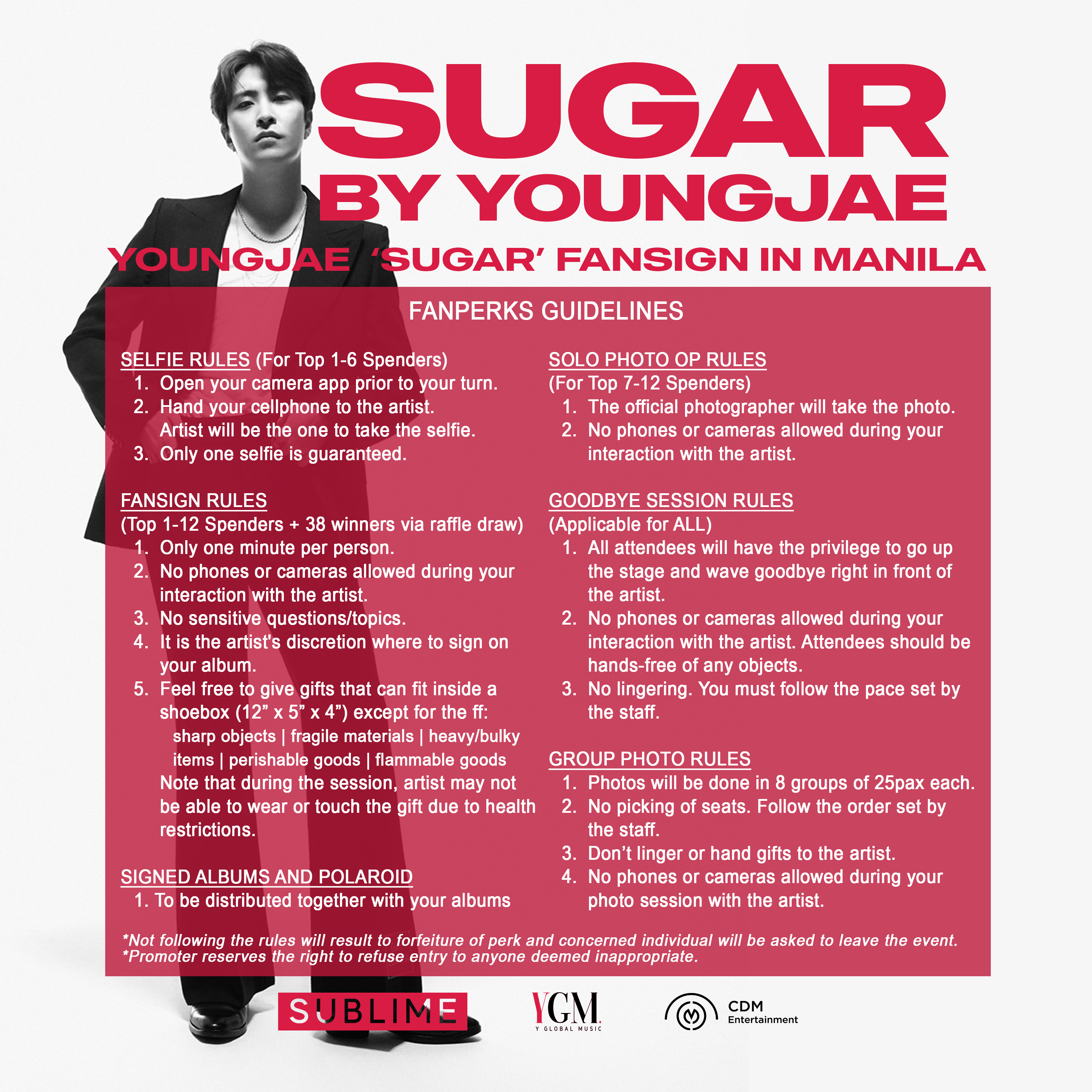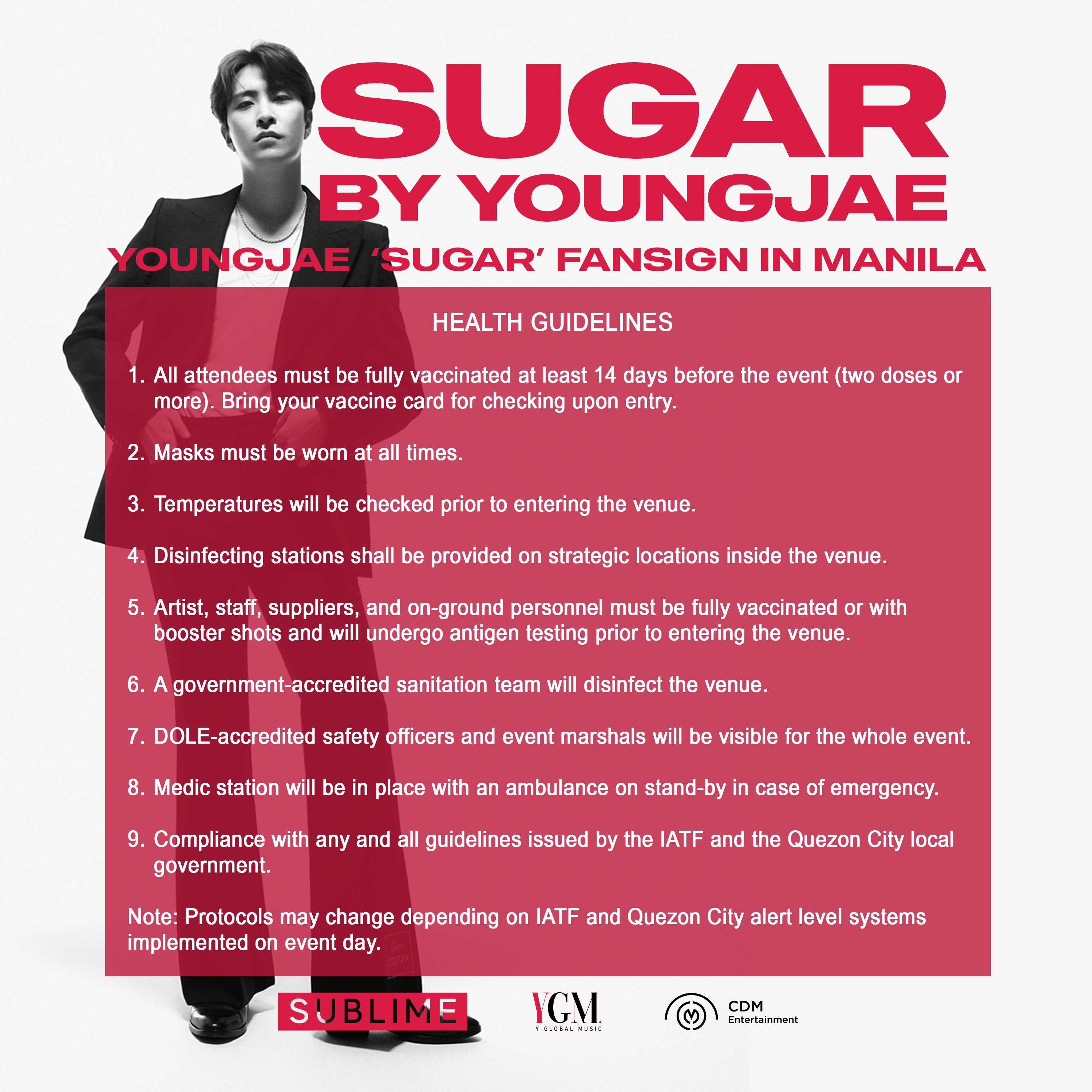 2022 YOUNGJAE MINI CONCERT: ‘SUGAR’ IN MANILA and YOUNGJAE ‘Sugar’ Fansign in Manila are presented by Y Global Music in partnership with CDM Entertainment.